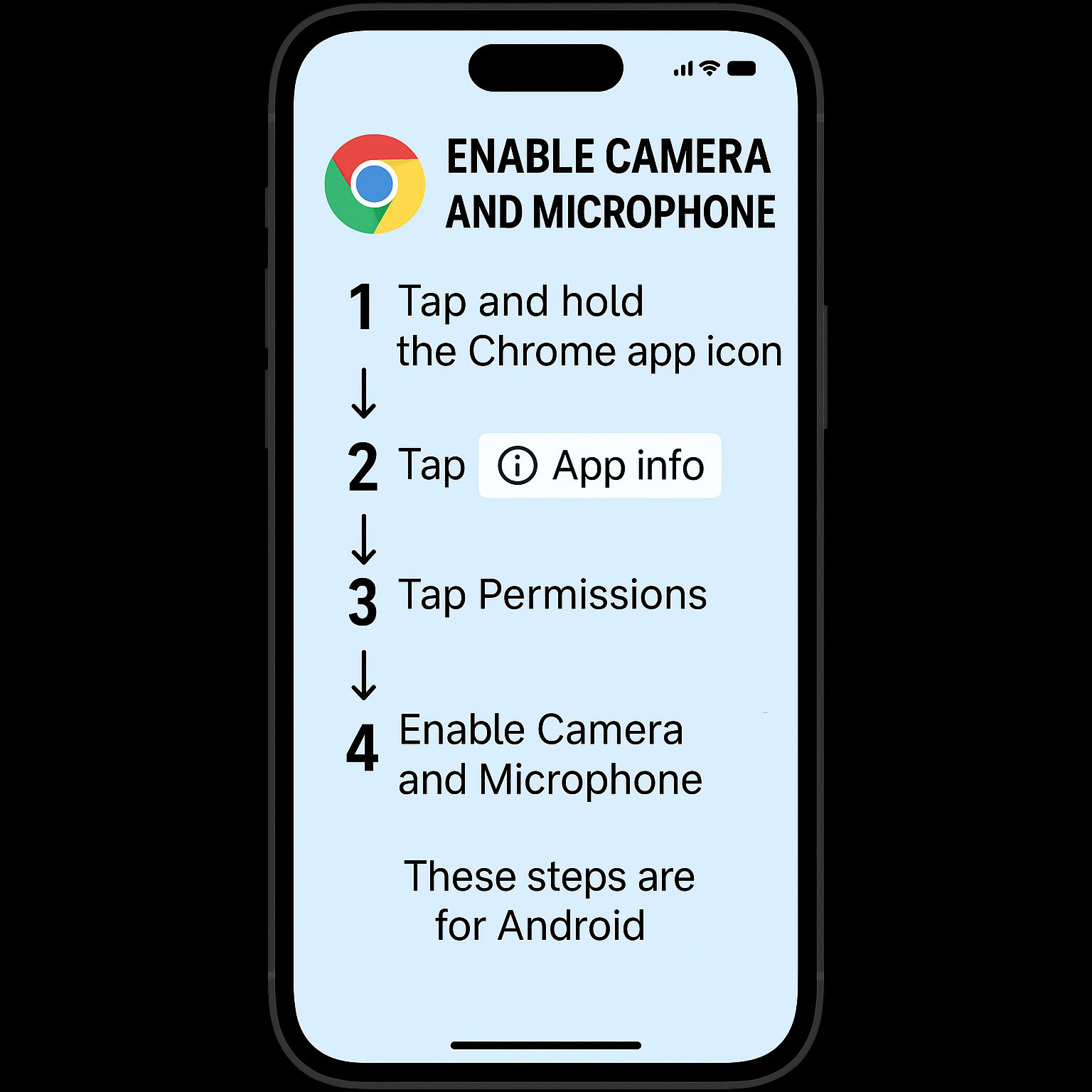 ✅ To fix this: long-press the Chrome icon → tap App info (ℹ️) → tap Permissions → enable Camera and Microphone. I’ve posted an infographic to make the steps clear.
